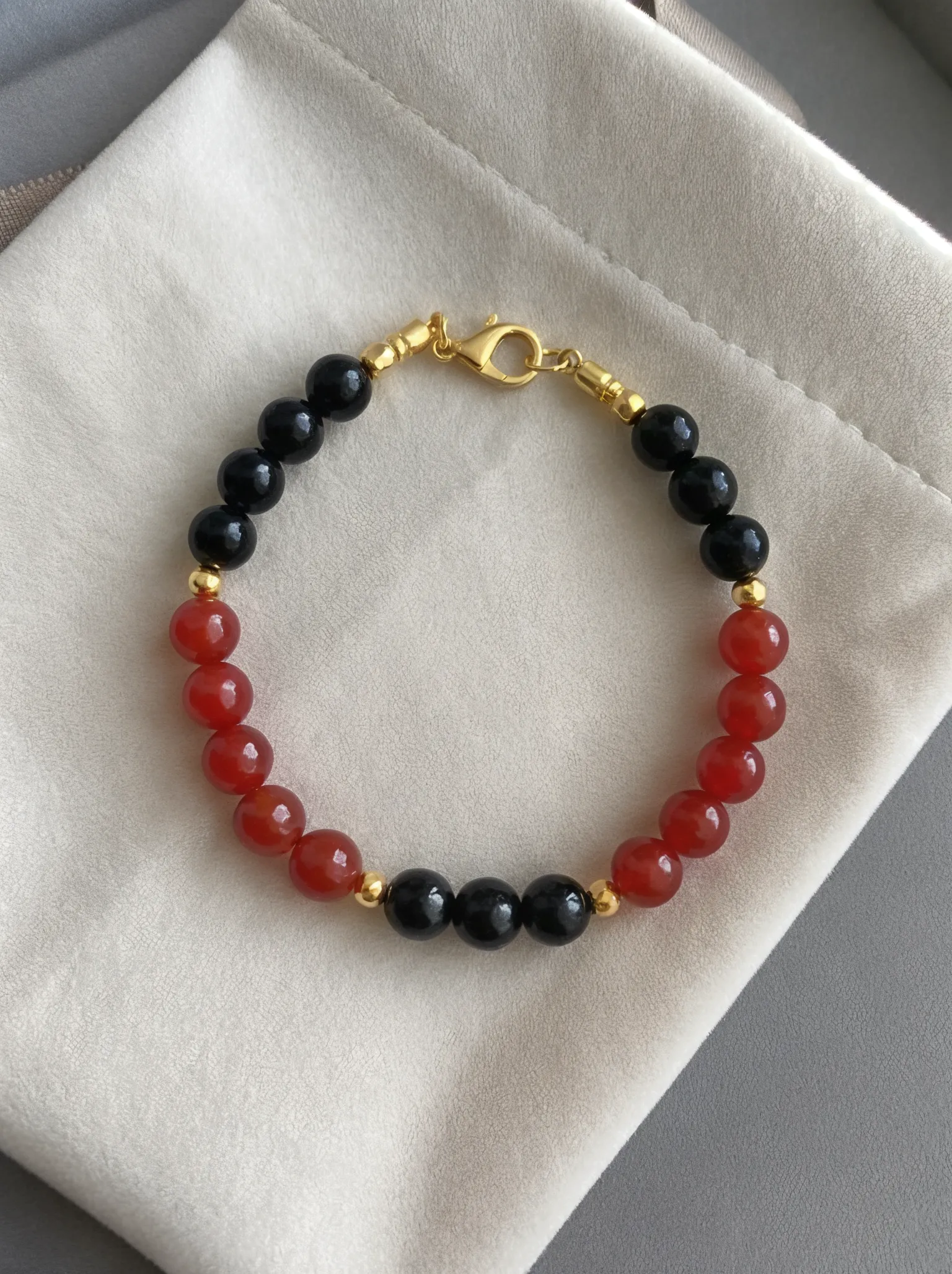 Accented with bright gold-tone hematite spacers and a matching gold-tone lobster clasp, this bracelet exudes warmth and luxury. The Carnelian stones bring vitality and creativity, while the Black Obsidianserves as a grounding anchor and protection against negative energy. It is an ideal piece for entrepreneurs, performers, or anyone who needs to maintain high energy levels without burning out. The combination stimulates both the Root Chakra (grounding) and the Sacral Chakra (passion), creating a flow of productive energy.