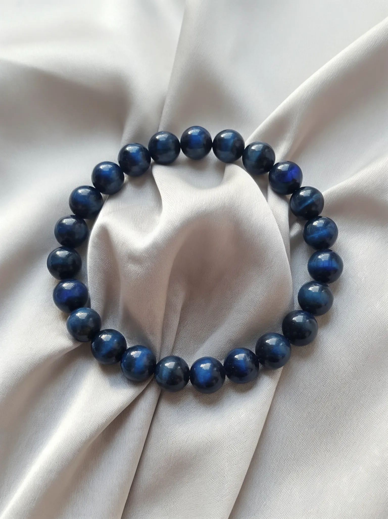This bracelet is crafted from high-quality Blue Tiger's Eye (also known as Hawk's Eye or Falcon's Eyr) beads. Distinguished by its deep, silky midnight blue hues, each bead reveals a striking chatoyant effect—a shimmering band of electric blue or grey light that moves across the surface as you turn your wrist.