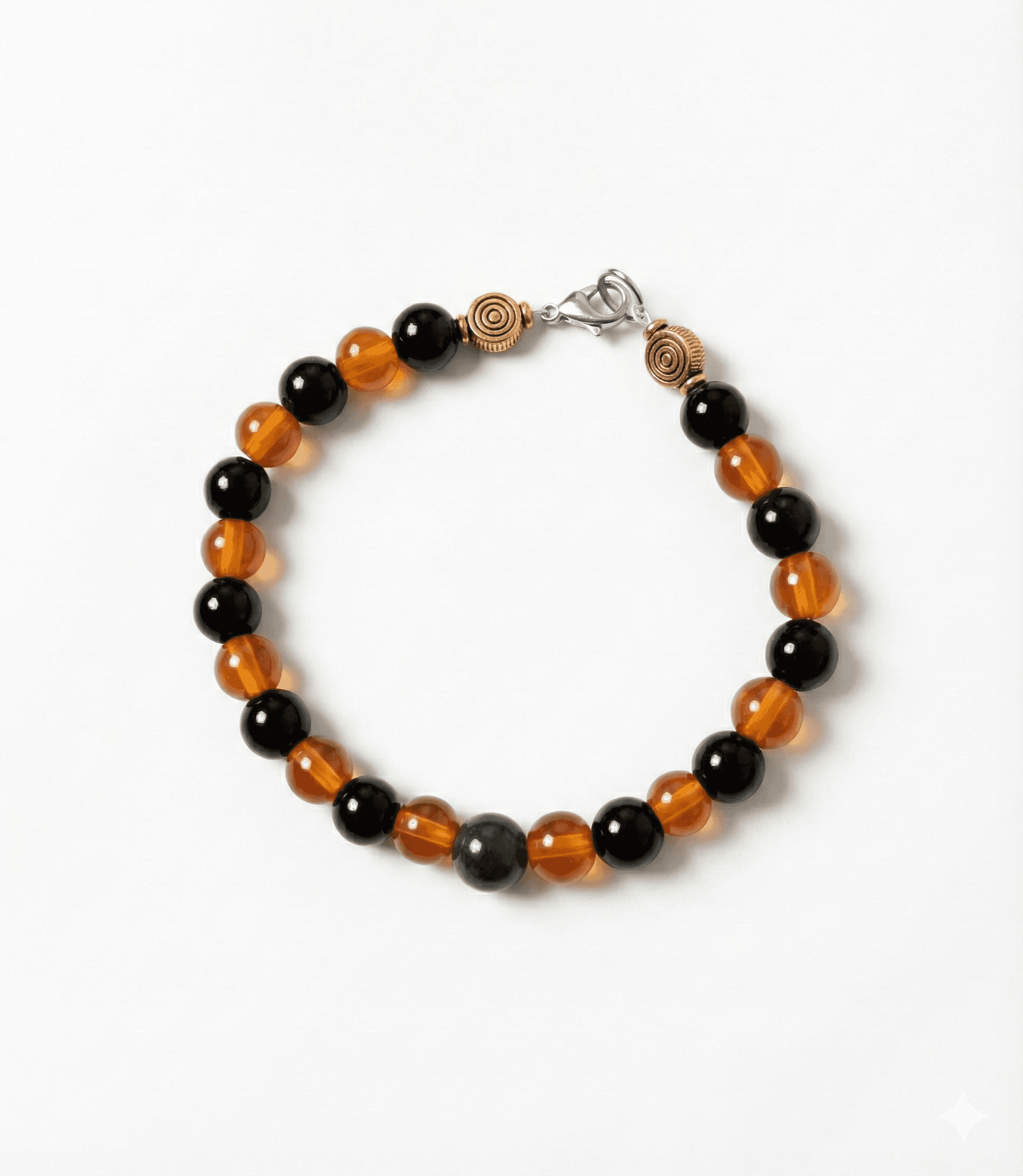 This sophisticated piece features a rhythmic alternation of two distinct gemstones, representing the balance between the earth and the sun. The bracelet is constructed primarily from glossy Black Onyx beads, known for their deep, light-absorbing surface, paired with translucent Honey Amber-hued beads (likely Honey Calcite or resin) that glow with warmth when catching the light.