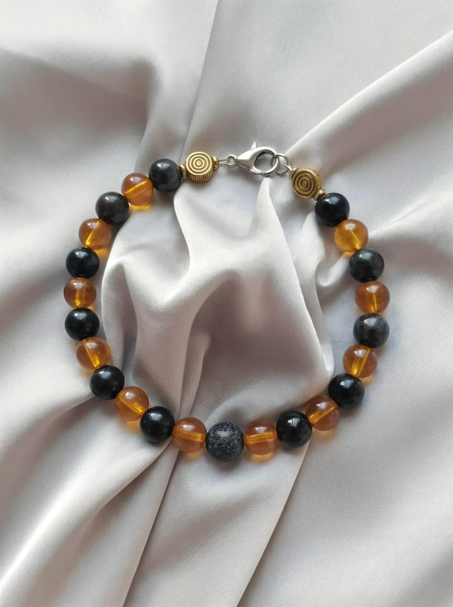 This piece features an alternation of two distinct gemstones, representing the balance between the earth and the sun. The bracelet is constructed primarily from glossy Black Obsidianbeads, paired with translucent gold-hued beads (Honey Calcite or Amber resin) that glow with warmth when catching the light.