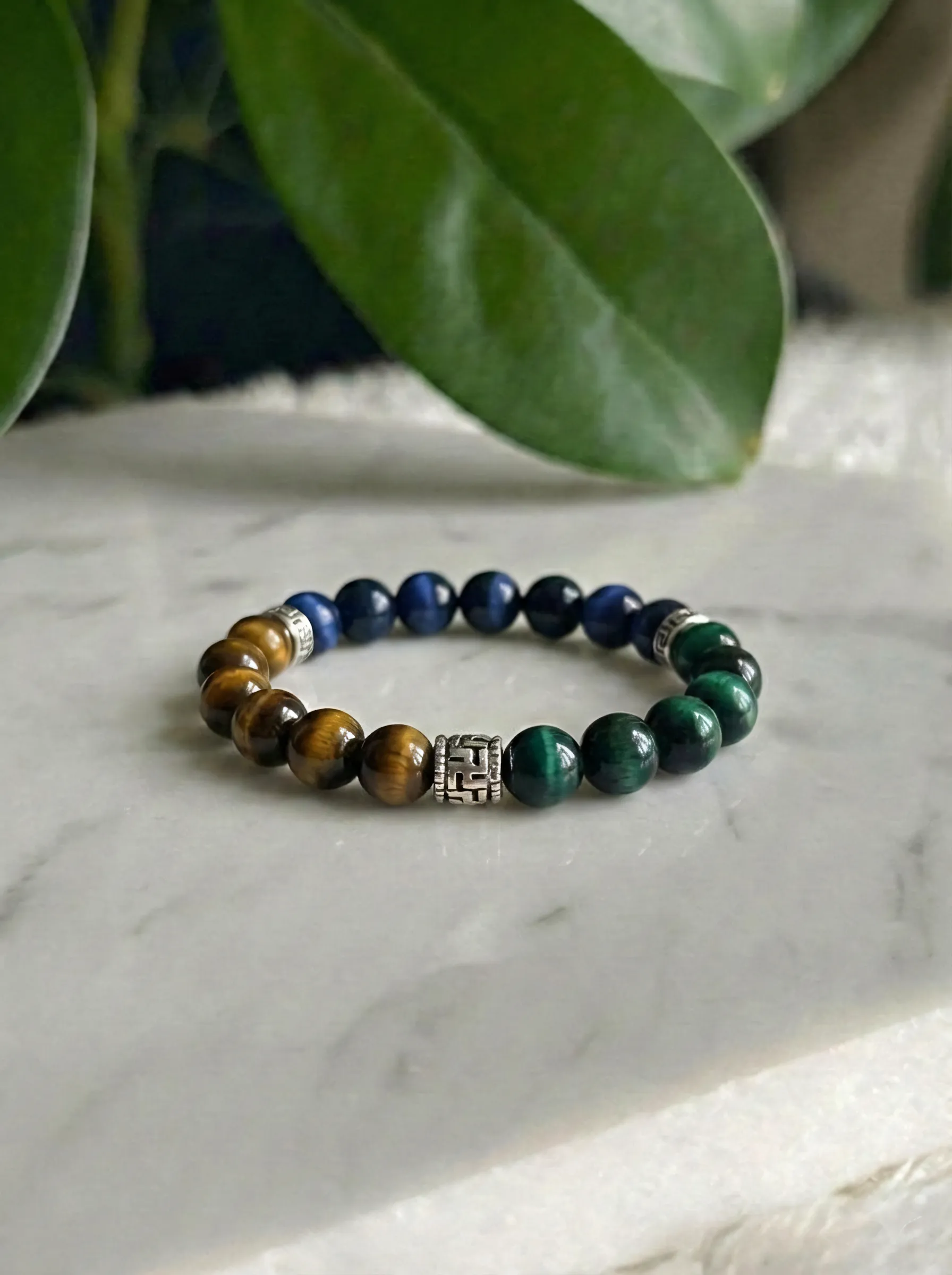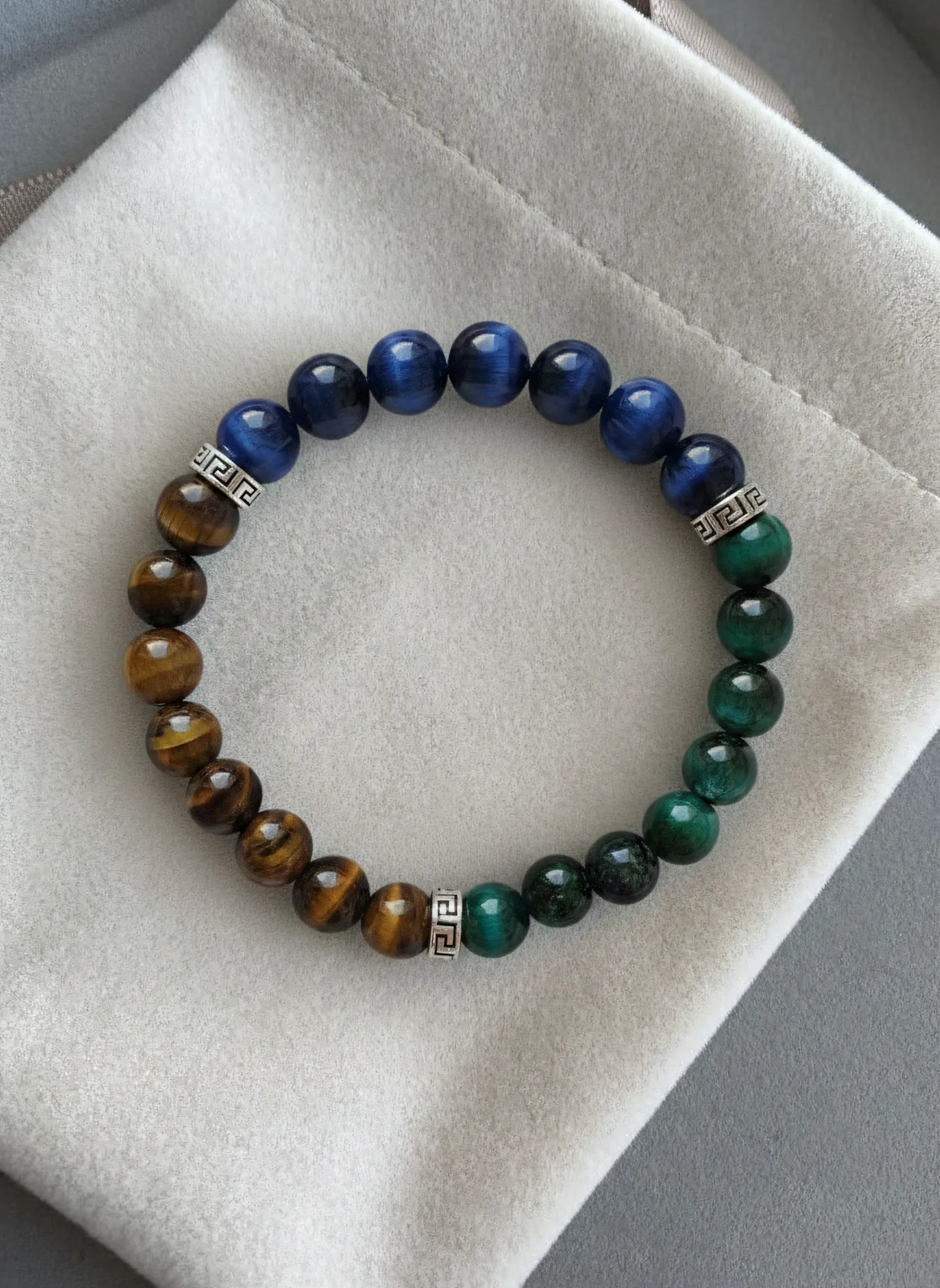 Separating these three distinct sections are silver-tone spacers featuring the Greek Key (Meander) symbol, representing the eternal flow of life. By combining these three variations, the bracelet serves as a holistic talisman: the gold grounds you in reality, the blue calms the mind, and the green opens the heart to growth. It is an ideal choice for individuals seeking balance between their ambition and their inner peace.